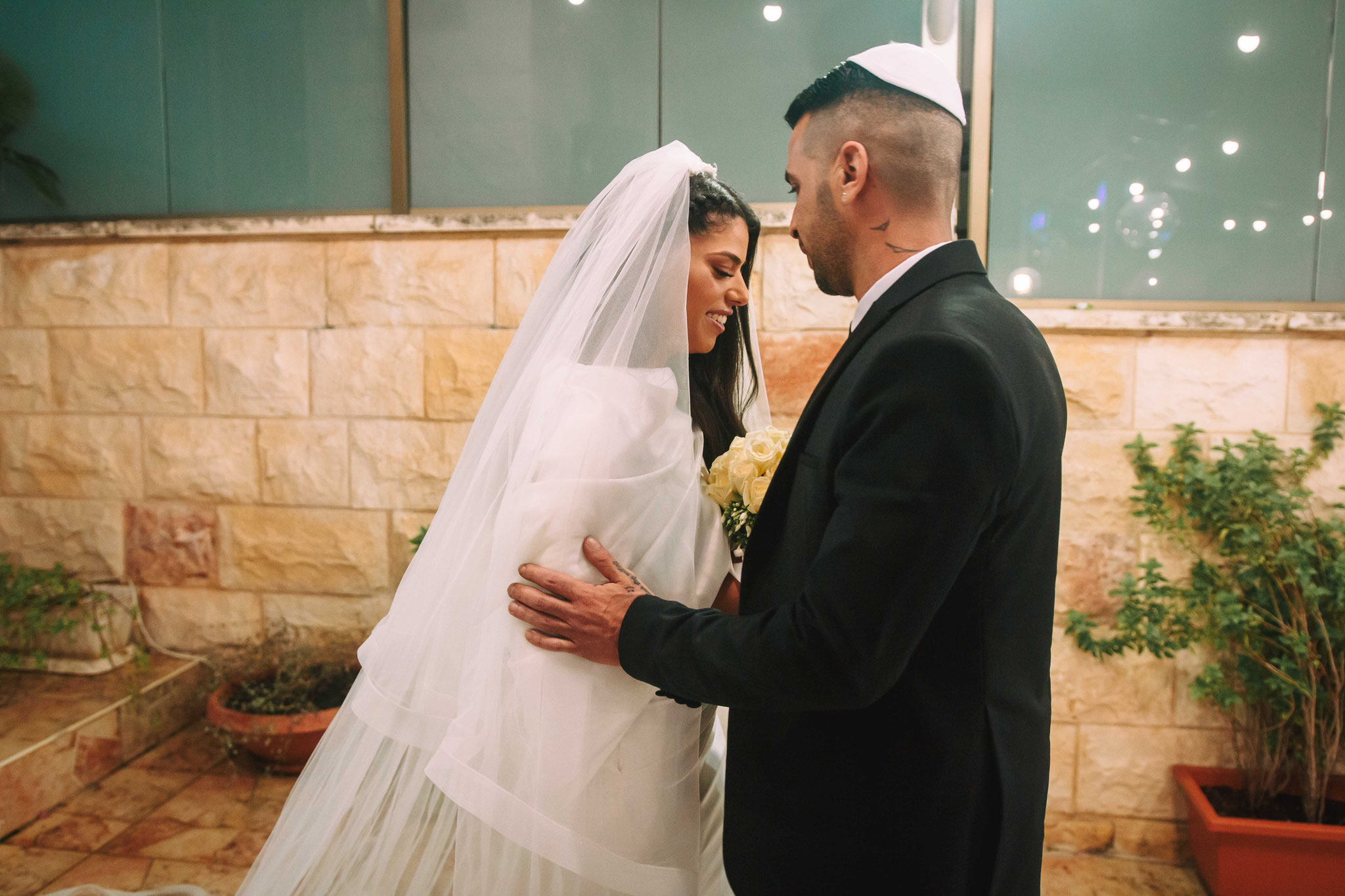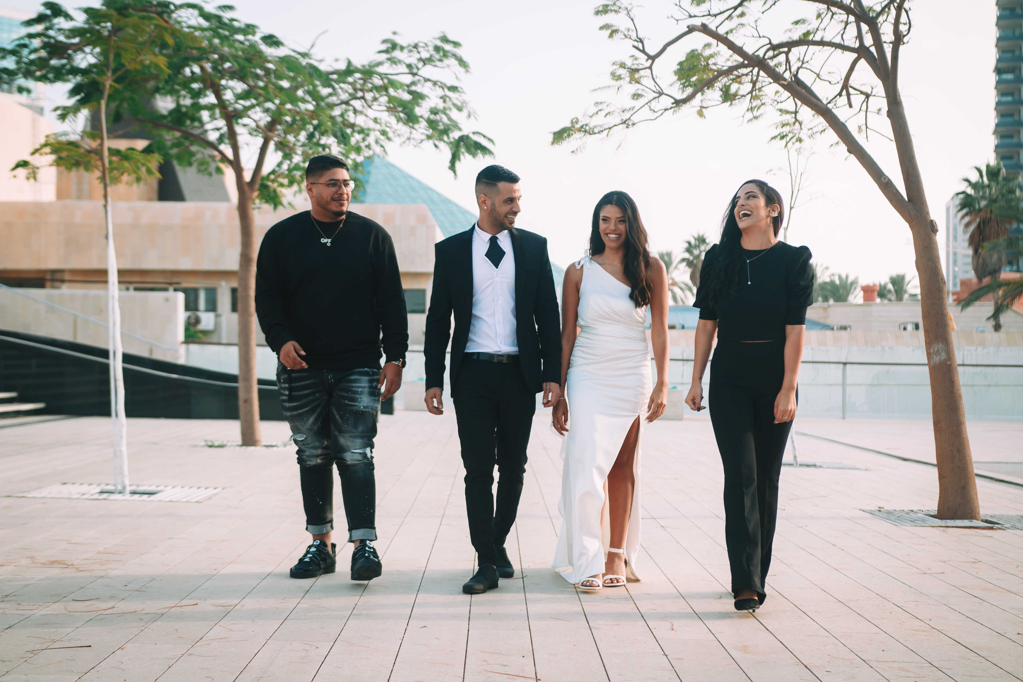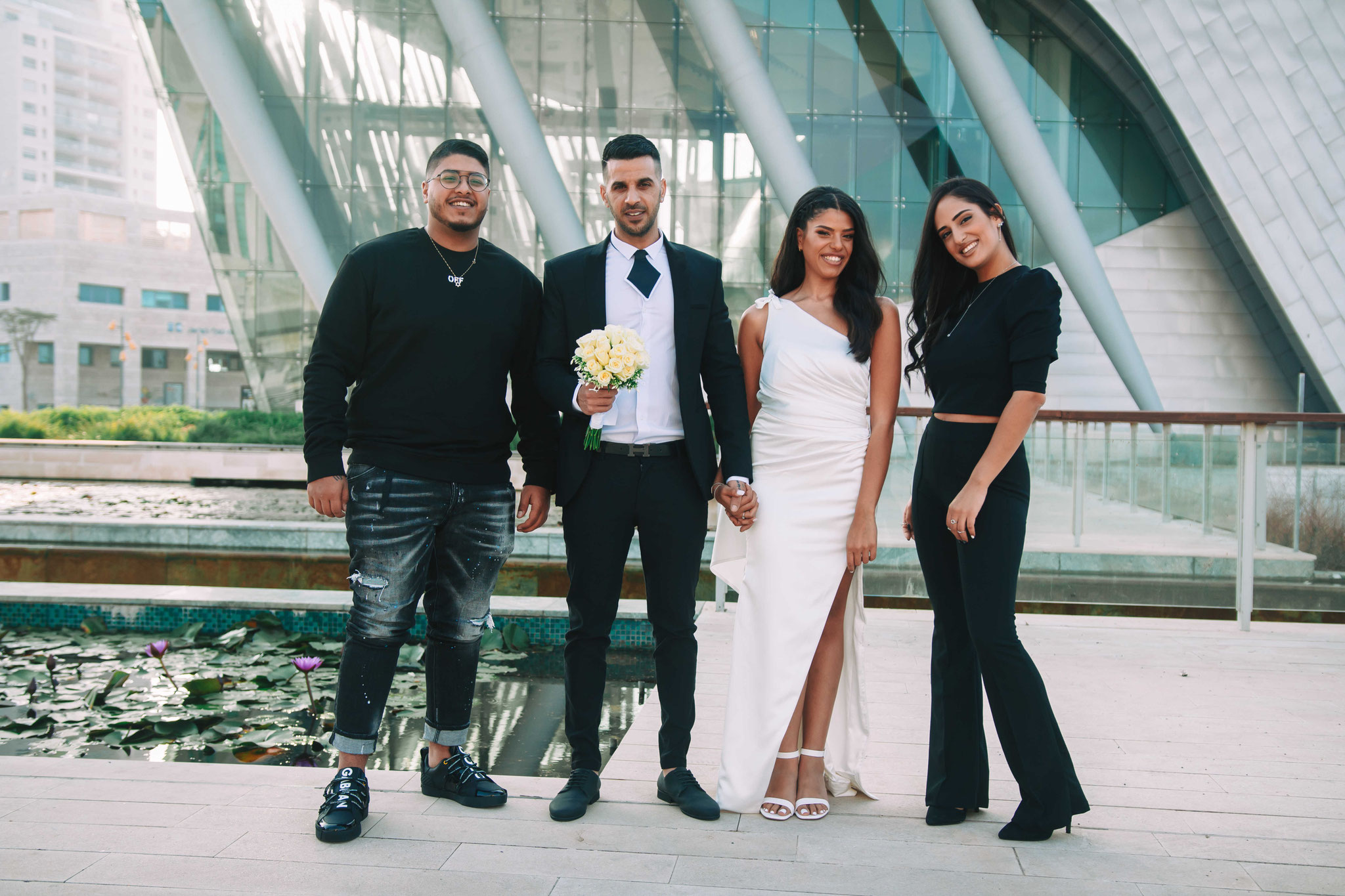 לאחר מכן הגענו לסלון כלות באשדוד בו חיכתה שמלת הכלה, וגם החתן לצילומים משותפים על יד הבר במקום. אפשר היה לראות את החתן נרגש לראות את הכלה לראשונה בשמלתה, החתן חיכה לה והם זכו לרגע מיוחד משלהם בהם יכלו להתחבק ולהתרגש יחדיו. החתן החזק בידיו זר פרחים כנהוג בחתונות והעביר את הזר לידיה של הכלה הנרגשת. הצילומים המשיכו לצילומי חוץ באשדוד במרכז אומנויות בו כלל המבנים נראים מעוצבים אדריכלית והיה ברור לי שהצילומים במקום יצאו מיוחדים. במרכז הזוג המאושר זכה להתהלך יחד , להתנשק ולרקוד מעט, במקביל גם להצטלם עם החברים המלווים בחתונה, וזכו בתמונות שנראות אורבניות ביחס למבנים במקום