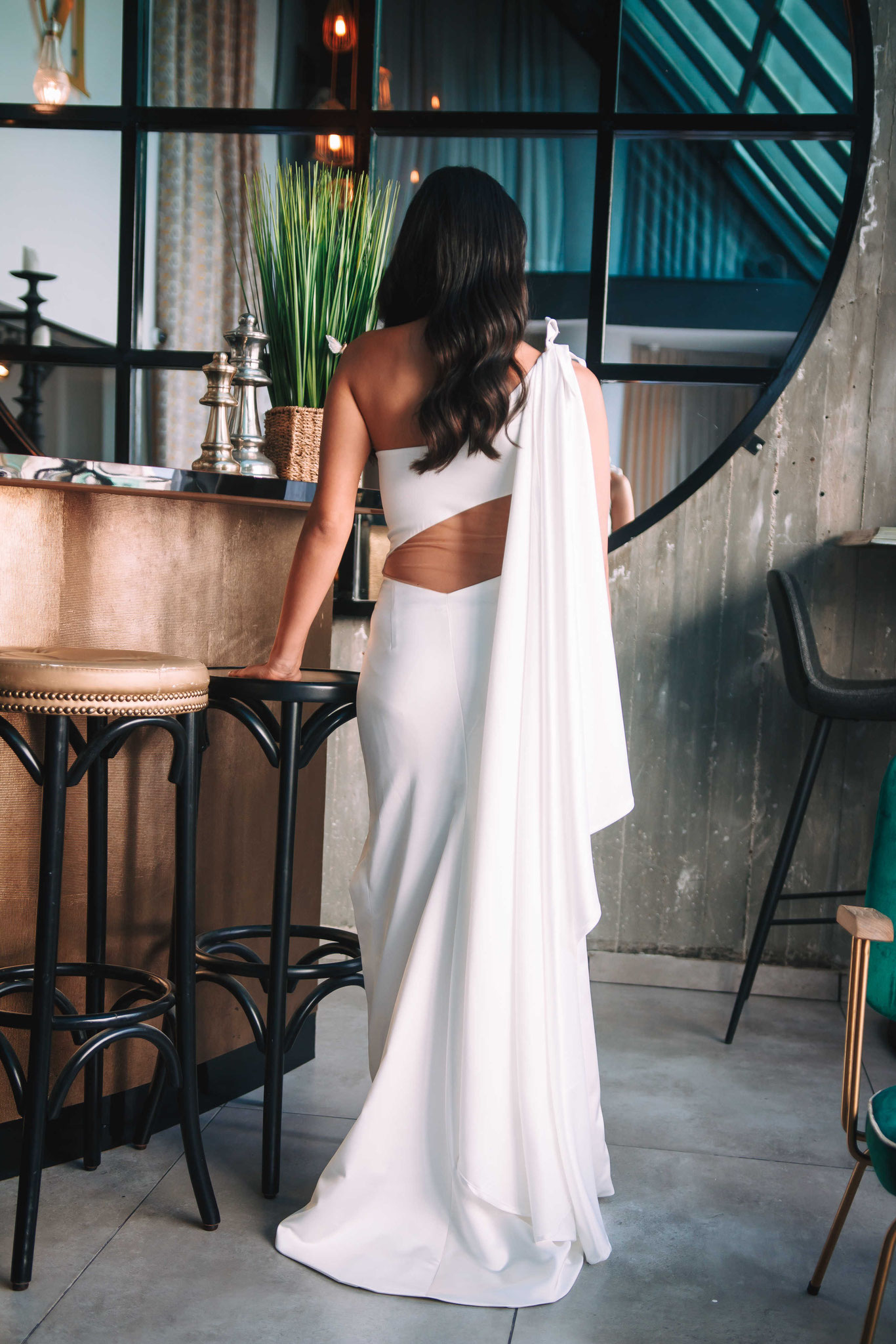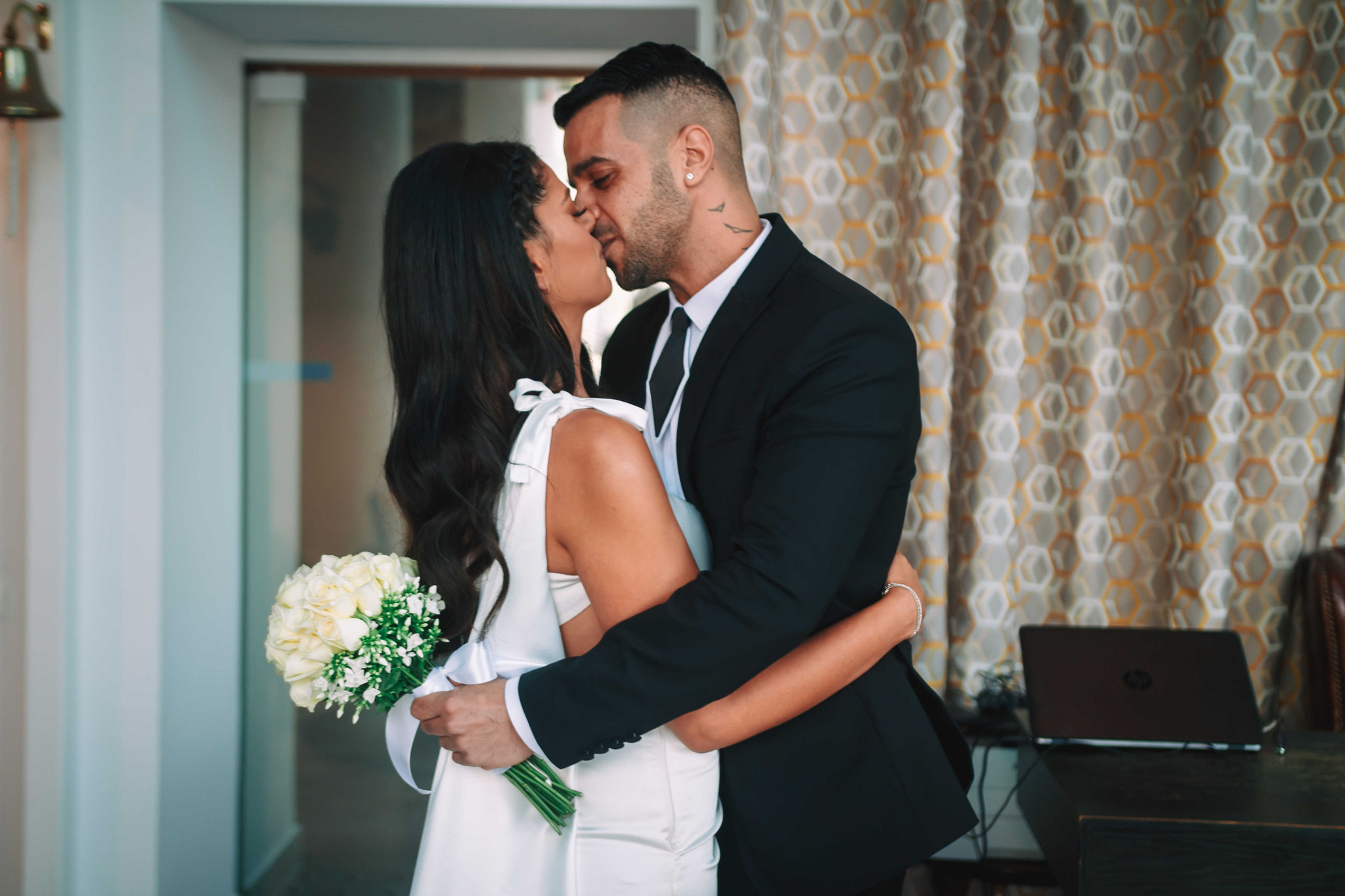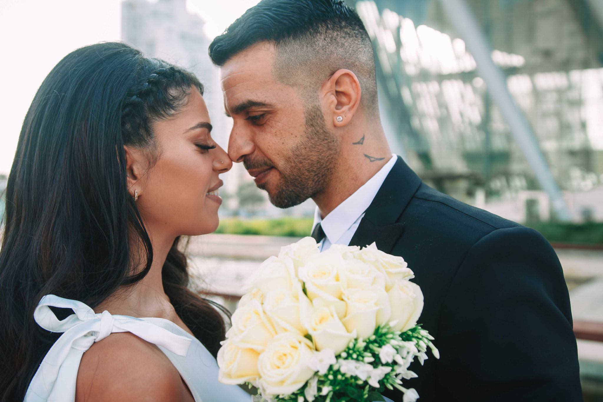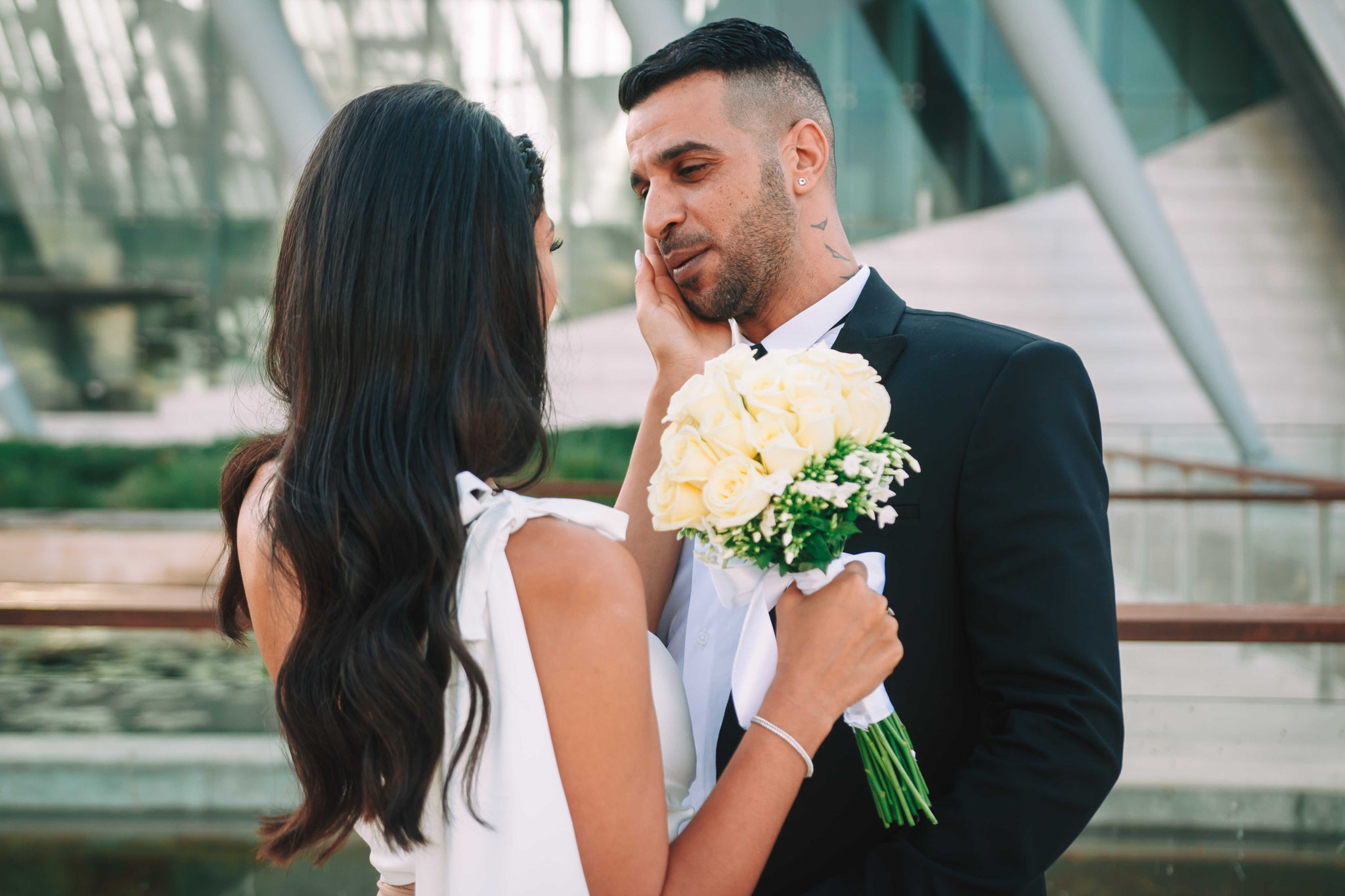 לאחר מכן הגענו לסלון כלות באשדוד בו חיכתה שמלת הכלה, וגם החתן לצילומים משותפים על יד הבר במקום. אפשר היה לראות את החתן נרגש לראות את הכלה לראשונה בשמלתה, החתן חיכה לה והם זכו לרגע מיוחד משלהם בהם יכלו להתחבק ולהתרגש יחדיו. החתן החזק בידיו זר פרחים כנהוג בחתונות והעביר את הזר לידיה של הכלה הנרגשת. הצילומים המשיכו לצילומי חוץ באשדוד במרכז אומנויות בו כלל המבנים נראים מעוצבים אדריכלית והיה ברור לי שהצילומים במקום יצאו מיוחדים. במרכז הזוג המאושר זכה להתהלך יחד , להתנשק ולרקוד מעט, במקביל גם להצטלם עם החברים המלווים בחתונה, וזכו בתמונות שנראות אורבניות ביחס למבנים במקום