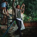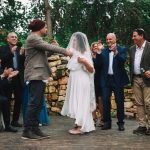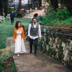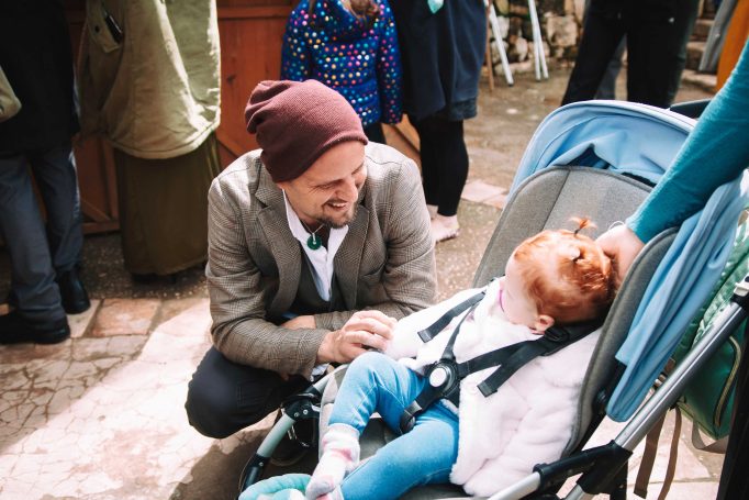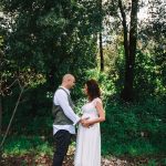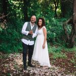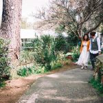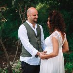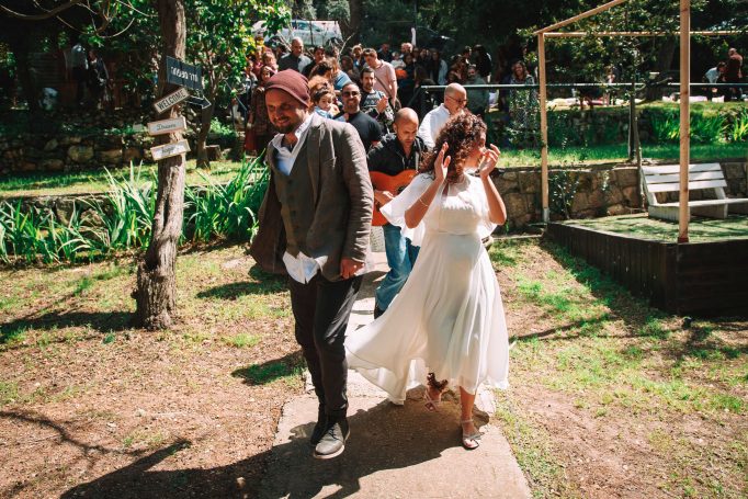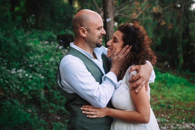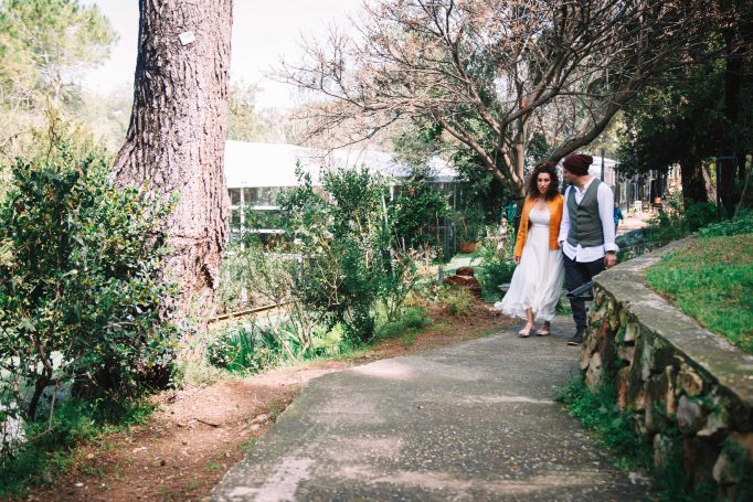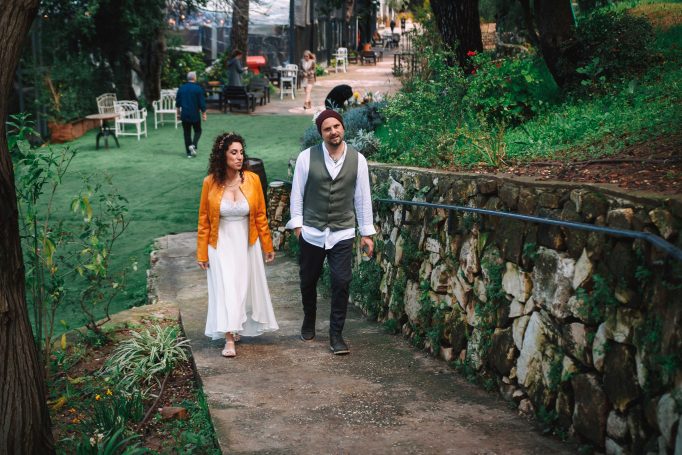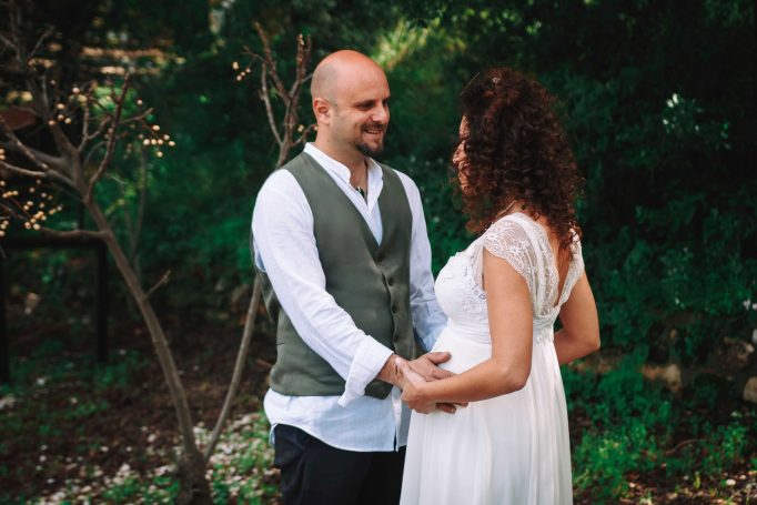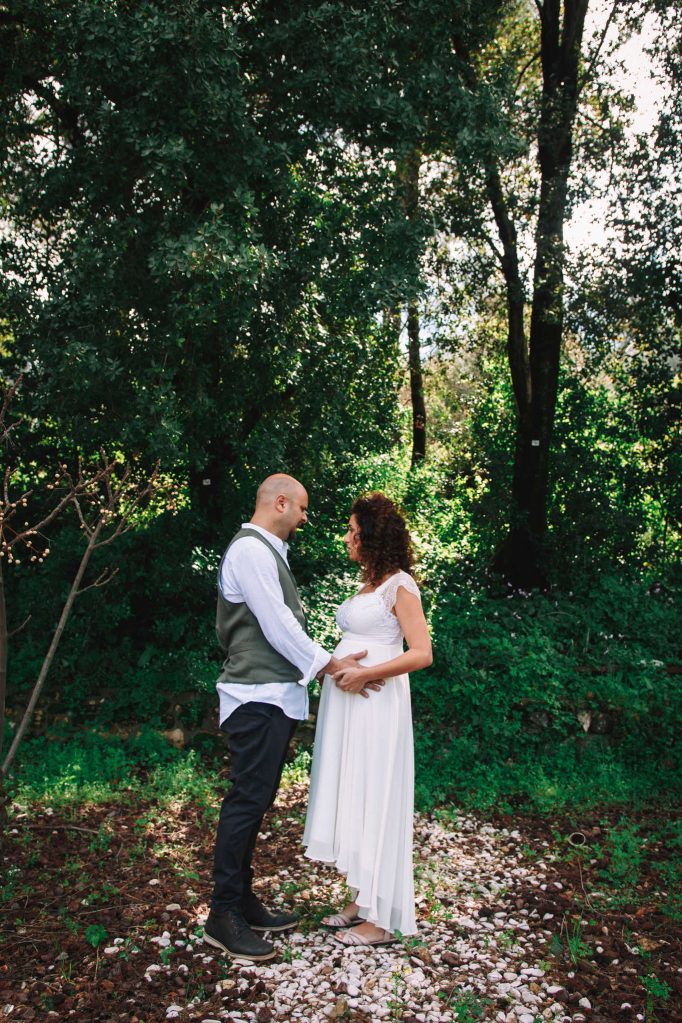 ומפה לקחתי אחורה. צילום מרחוק. אותו המקום, אותם רגליים הדורכות על אותם חלוקי אבן, אך הפעם הכנסתי את כוך הגוף לתמונה. הזוג הטרי אוחז ידיים והבעל עם ידו השמאלית אוחז בבטנה של כלתו. ללא כובע הבורדו על ראשו של הבעל, וללא הז'קט הכתום מעל שמלתה של הכלה, הזוג בזמן של כמה שפחות מחיצות ביניהם, זמן אינטימי עם הצמחייה ברקע. הירוק המהפנט הזה מתמזג עם חלוקי האבן הלבנים – אווירה כפרית ייחודית , חושבים על העתיד, על דור ההמשך