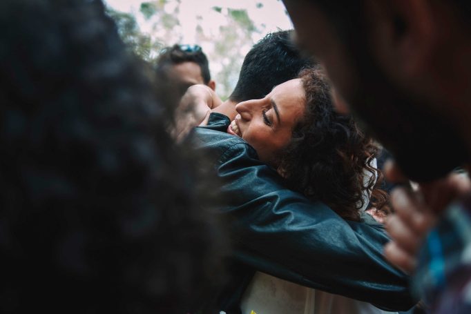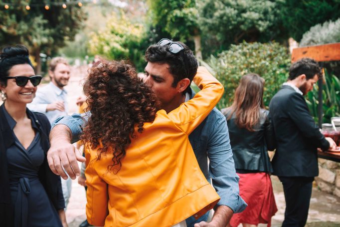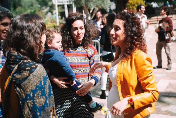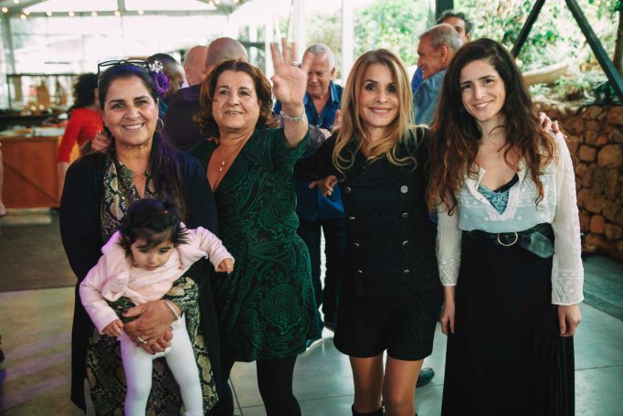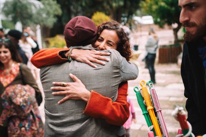 תפסתי שתי אורחות שלא ראו אחת את השנייה זמן רב, האחת עם חולצה כתומה ומשקפי שמש על ראשה, מחבקת את השנייה, חיבוק חם ונרגש – חיבוק של געגוע וכיסופים. התמקדתי בצילום בחיוך הנרגש שעל פניה ובעצימת עיניה מהתרגשות. החיבוק מהפנט, חיבוק שעוצר את הזמן מלכת ומחברם אל העבר המשותף. זוהי סיטואציה שאם לא אצלמה תפוספס ותישכח