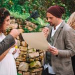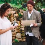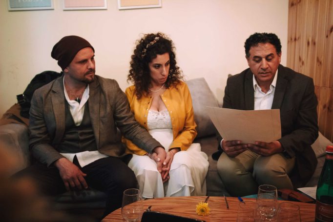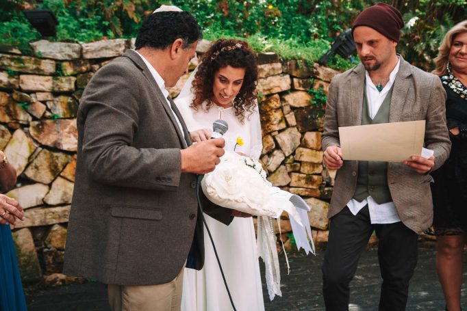 הביתן הכפרי משרה אווירה נינוחה. והרב הישוב על הספה לצד החתן והכלה, הכתובה על השולחן וההורים משני הצדדים, הם מצידם עם הגב למצלמה