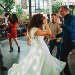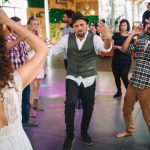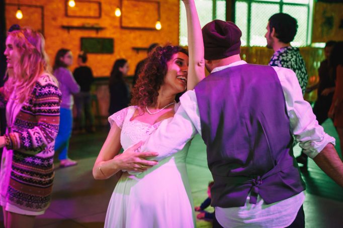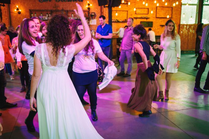 החתן בצילום תקריב שהוא אוחז בידיה של אחת מהאורחות ורוקדים להם. החיוך המאושר שעל פניה ומסתכלת היא לתוך עיניו