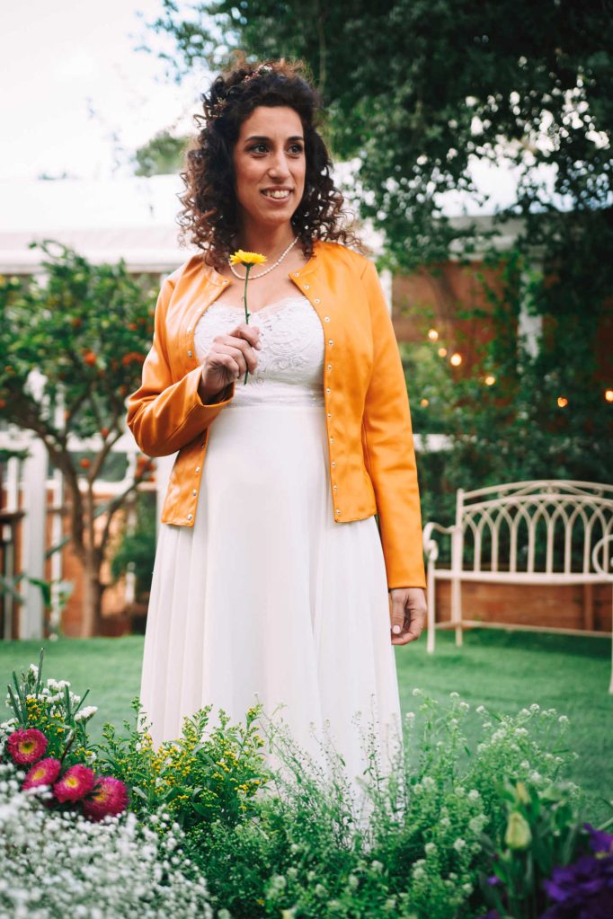רציתי גם לתת לכלה את המעמד שלה, אחריי שהתלבשה כה יפה, והשקיעה רבות בסידור השיער. הינה היא עומדת עם הז'קט הכתום על שמלתה וצמח חרצית בידה, מתבוננת על המתרחש מסביבה. איזה חיוך? איזו התרגשות, הזמן שלה להכיל את פרפרי הבטן, לעכל את המעמד המרגש אליו היא נכנסת. פרח החרצית אשר מסמל אהבה אך גם את השבריריות שלה, אני הולכת לשמור על האהבה שלי, על הבית שלי – אני עיקר הבית. הגבעול הוא אחד, אני ואהובי ומפה העלים יצאו ויתפתחו מגבעול זה, חוסנו של הבית זה באחדותנו